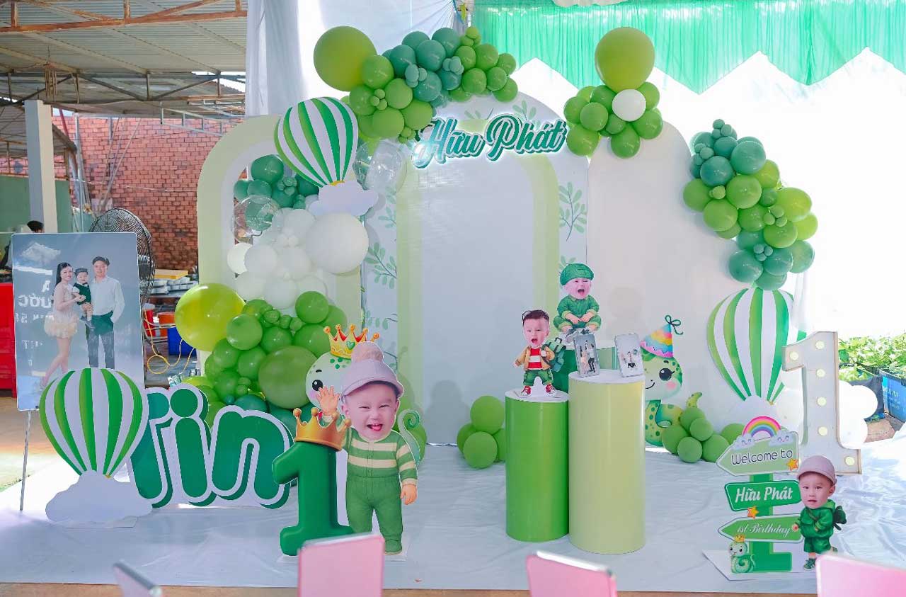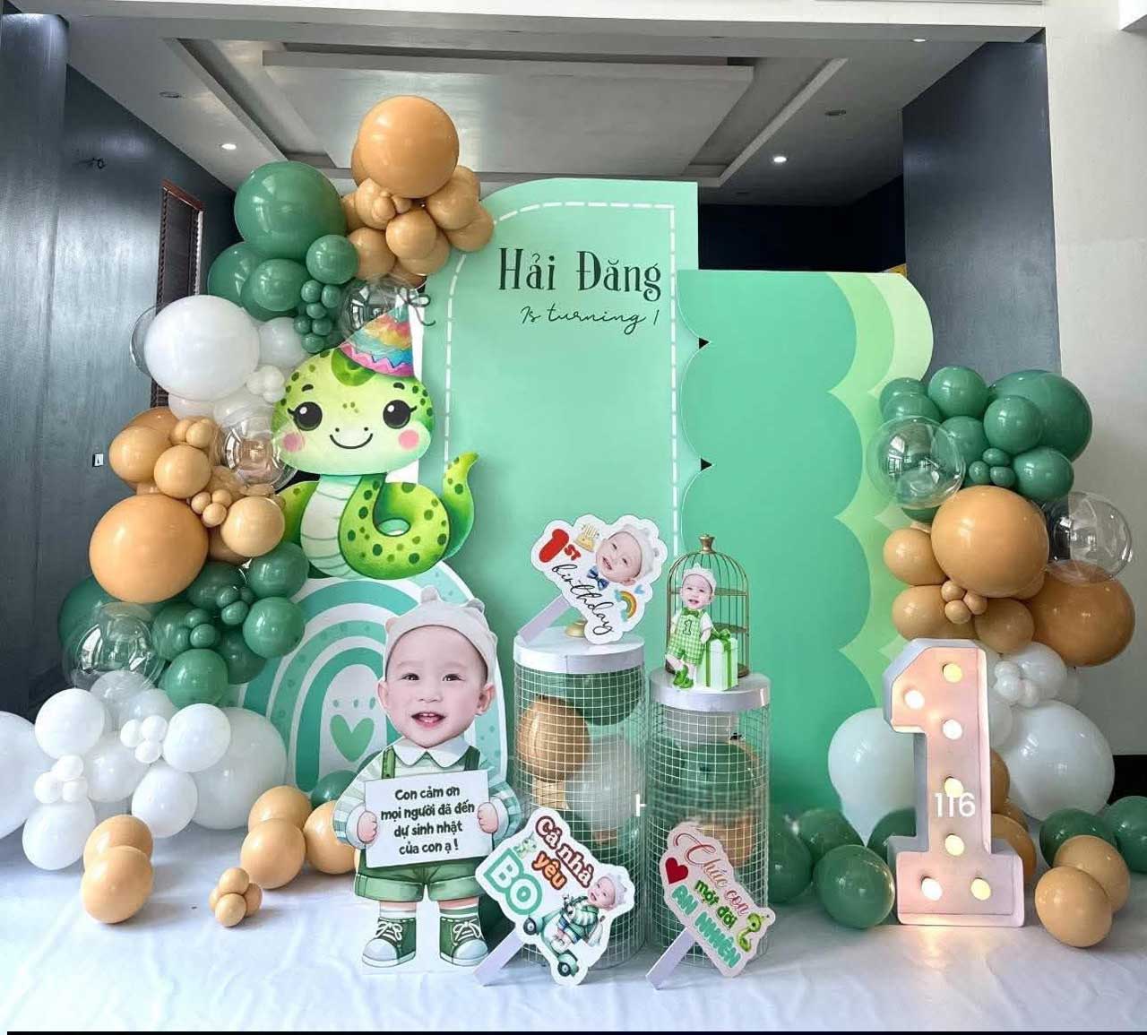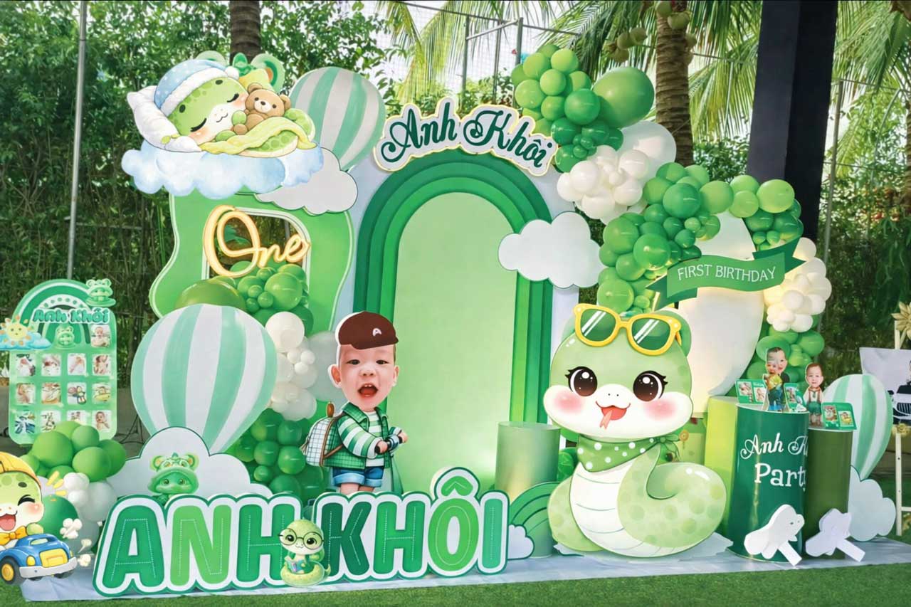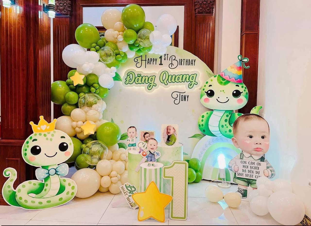 Backdrop bé trai tuổi rắn tone xanh lá dễ thương sẽ giúp cho buổi tiệc thêm độc đáo, đáng yêu và cực kỳ nổi bật.