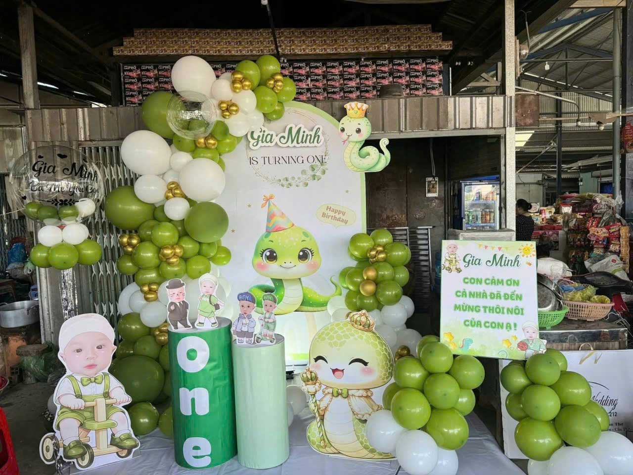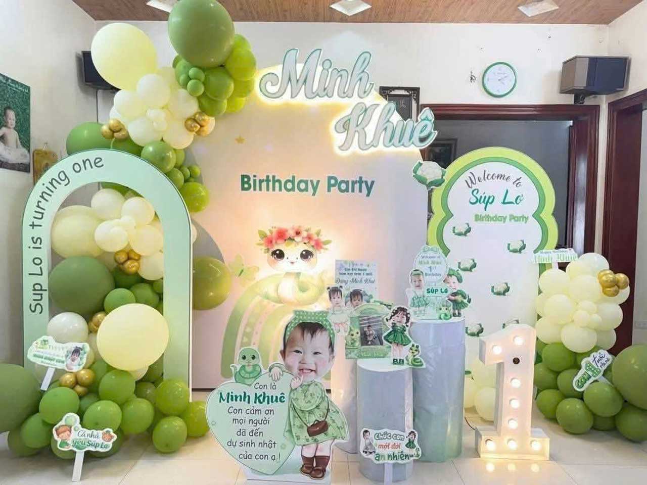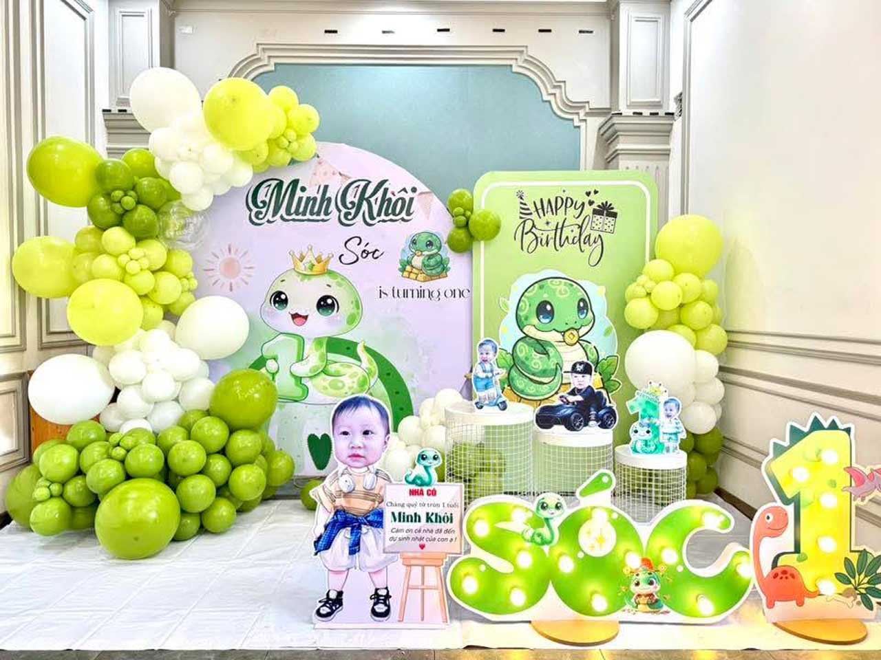 Backdrop bé trai tuổi rắn tone xanh lá dễ thương sẽ giúp cho buổi tiệc thêm độc đáo, đáng yêu và cực kỳ nổi bật.