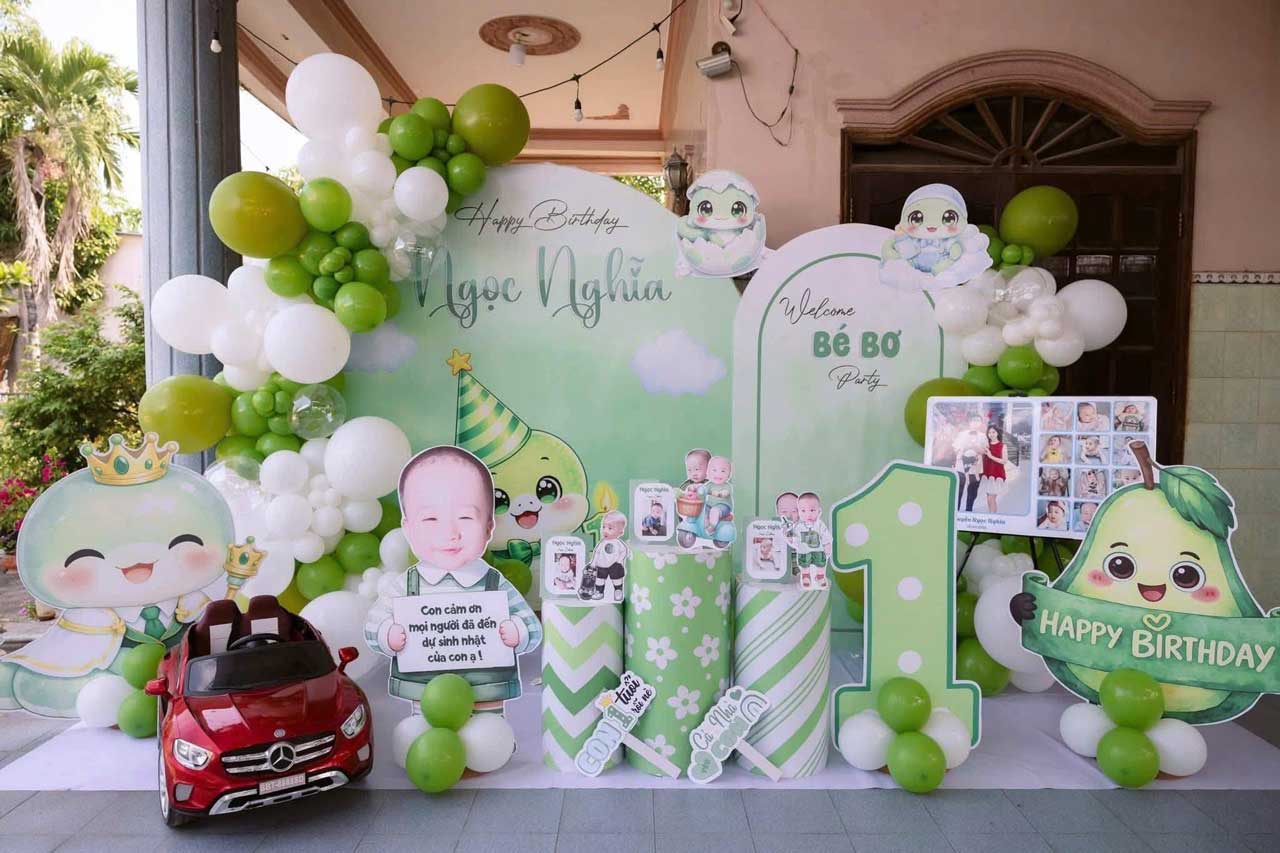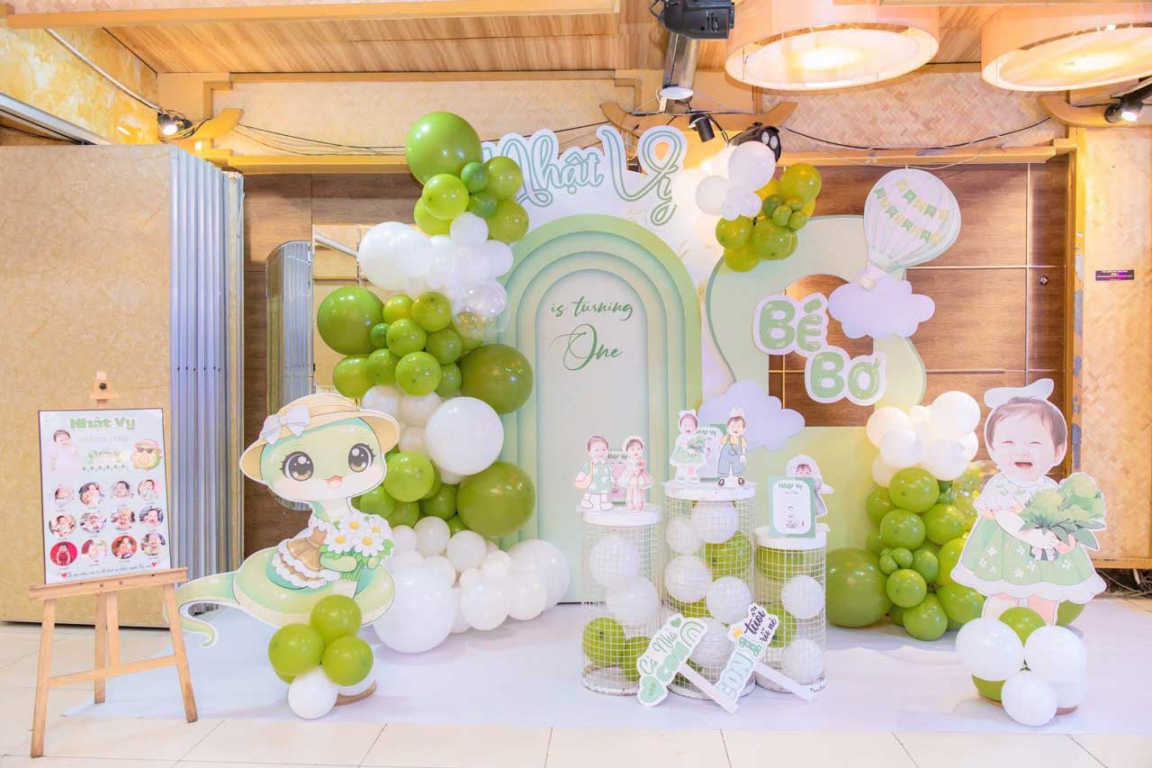 Concept backdrop bé Tuổi Rắn tone xanh lá – Xu Hướng Trang Trí thôi nôi mới 2026