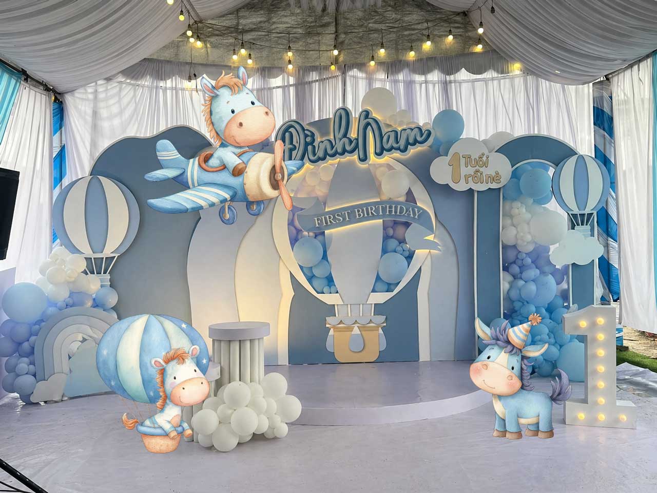 Mẫu decor các bé tuổi ngựa nên decor gì với khinh khí cầu màu xanh bé trai tuổi ngựa