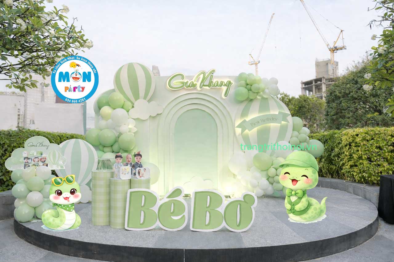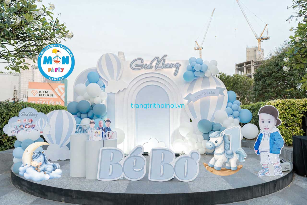 Đây là kiểu setup rất phù hợp cho đầy tháng, thôi nôi, sinh nhật bé trai hoặc cả bé gái thích màu nhẹ nhàng